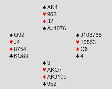 Så var det å vinne slemmen. Det kan se ut som å trumfe nords tredje spar er greit, så satse på at kløveren ordner seg. Tas den sparstjelingen tidlig kan det fort bli bet, for slik så hele spillet ut:
