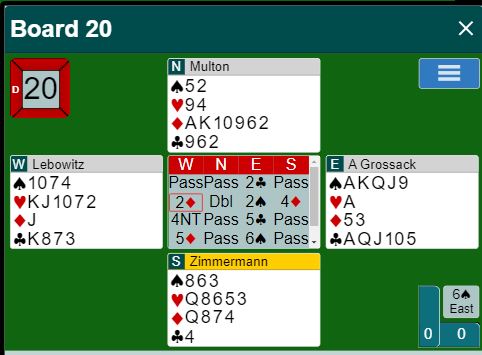 Amerikaneren på norsd plass åpnet med 2 ruter. Øst meldte inn 4 kløver. Det antas at det viste en sterk hånd med minst fem kløver og en majorfarge på minst fem kort, såkalt Leaping Michaels. Jeg liker ikke så godt at slike Leaping-Michaels meldinger har ukjent majorfarge som noen bruker etter motpartens svake 2 ruter og over Multi 2 ruter. Hvis ikke makkeren vet hvilken majorfarge det er kan det bli vanskelig å melde for makkeren om nestemann også melder. Og det skjedde her, syd sa 5 ruter. Etter denne starten, drømmestarten for oss som spiller med svake 2 ruter ble det ikke så lett for Ø/V. Det doblet sluttkontrakten og noterte seg for tre bet og +800. Det var alt for lite, 12 IMP til det amerikanske laget.
