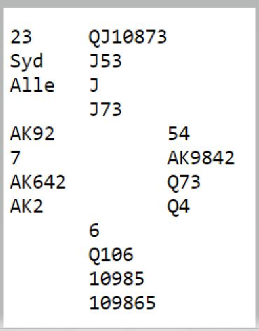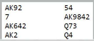 Dette er nok et tilfelle hvor det er slik at hvis man melder knallhardt til 7 ruter som altså ikke er så aller verst, så blir det bet, bare for kanskje å finne ut at motpartens Ø/V-par ved det andre bordet spilte utgang! Tapt spill, og å melde "kun" lilleslem ville vært nok til å vinne spillet stort