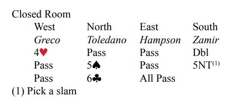 Ved det andre bordet fant nord en bra melding, men selvsagt med en viss fare for at de var for høyt allerede. Som svar på syds opplysende dobling av 4 hjerter hoppet nord til 5 spar, simpelthen en naturlig sleminvitt. Da meldte syd 5NT, "pick a slam", og nord foreslo 6 kløver. Slik gikk altså meldingene ved det bordet: