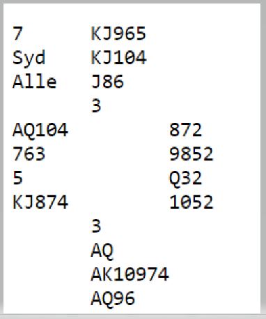 Jeg aner ikke hva som har hendt med kortene. De vi spilte stemmer ikke med de som ligger i kortfila for 6.mars. Det som er enda mer merkelig, er at jeg ikke kan finne kortene vi spilte i noen av de kortene vi har spilt i tidligere resultater, så hvis noen gir meg et tips, så skal jeg sjekke på ny.