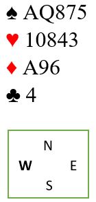 Syd åpnet 1 kløver, nord melder av hjerteren sin, men ingen i makkerskapet blir enige om noen trumf. Det hindrer de uansett ikke fra å melde slem, og like etter de i 6 NT. Vest spiller ut ruter 10 til esset i syd, etterfulgt av ruterknekt i andre stikk. Så endelig server syd en liten spar mot bordets Q84. Hva gjør du i vest nå?