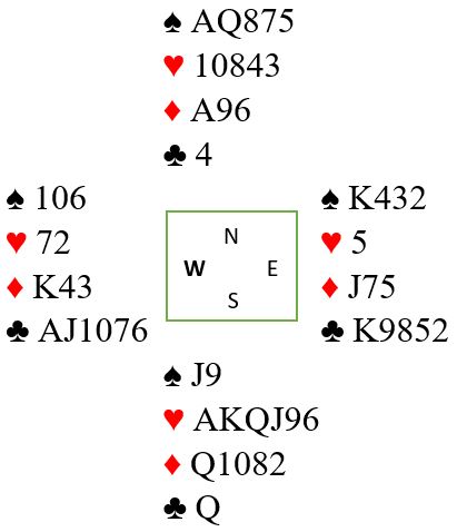 I 6 hjerter går det ikke an å unngå spartaper så ruteren må gå for at det skal kunne bli tolv stikk. Med åtte rutere til sammen er beste sjanse å ta finessen. Damen foran er 50%, men en liten tilleggsjanse er at damen sitter singel bak, for før finessen tas bør en topphonnør innkasseres. Å spille på damen dobbel bak er klart mindre sjanse enn damen tredje, fjerde eller femte foran. I tillegg til rutersjansen kan jo det hende vest noen ganger spiller ut kløver ess mot slem, og med kongen godspilt er det ingen problemer, kun en spartaper og mulighet for tretten stikk. Men meldingene kan kanskje ha avslørt at kløver ess ut er fånyttes, for noen steder vil syd ha fortalt om renons i kløver.