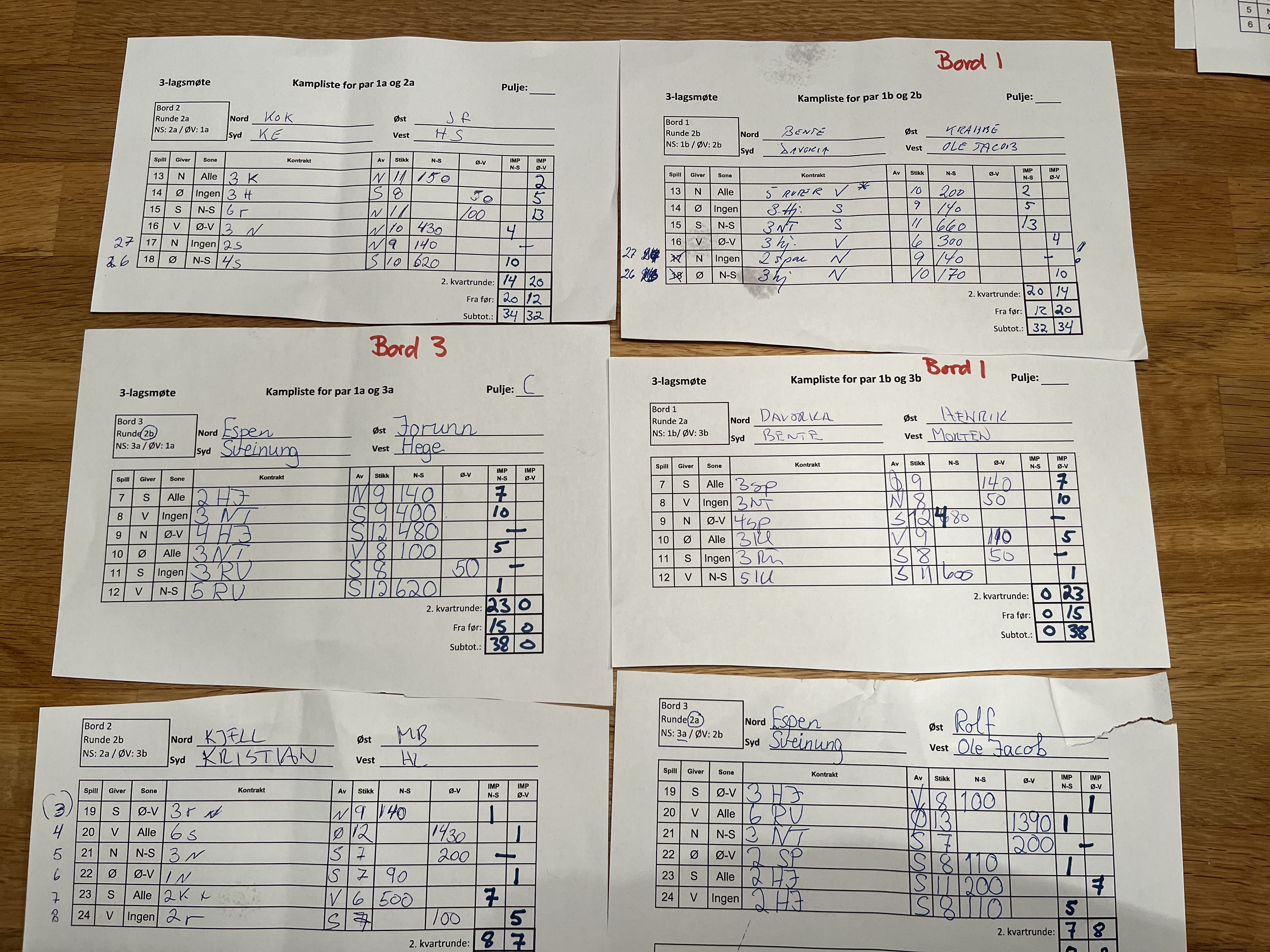 Som følge av en misforståelse med spillested ble det ikke spilt i åpningsrunden på bord 7 i lukket rom mellom Holmestrand lag 8 og Holmestrand lag 7. Spillene ble først forsøkt scoret som "ikke spilt", men da ble kontrakten "Pass" registrert av systemet på samtlige 6 spill uten at jeg oppdaget det. I ettertid har jeg etter å ha mottatt gode forslag fra både Roger, Einar og Thor H endret kampresutatet til 12 - 0 i favør av lag 7. Når det gjelder butleren fikk begge parene som skulle ha spilt runden i Lukket Rom +1 poeng hver etter at jeg registrerte Frirunde/Ikke spilt. Mest korrekt hadde kanskje vært 0 for begge parene som satt i Lukket rom" ?.
