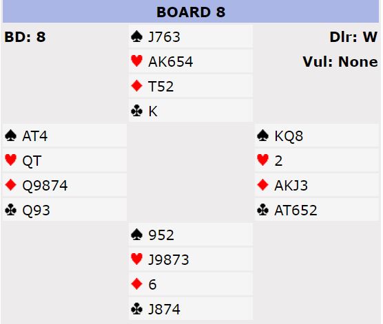 Ved ett bord jeg fikk referert til så passet syd i åpning og vest åpnet i 3 hjerter. Øst gikk i boks og etter ett par kaffekopper kom det en stille og rolig 4 hjerter. De diskuterer ennå hvorvidt vest har lovet så mye kort eller ei.