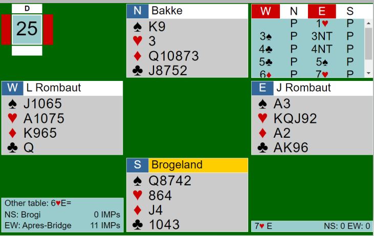 I runde 18 (av 22) møttes BROGI og APRES-BRIDGE CHAMPS, et fransk-tysk lag i BBO-overført kamp. Det laget er også godt med i denne turneringen og ligger på 4.plass. Og de tok ledelsen i kampen med 11-1 etter fire av 10 spill, men så kom dette: