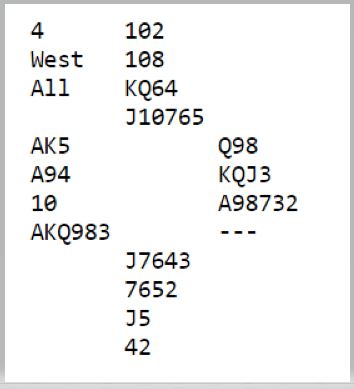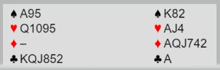 I den siste kampen kom det til slutt to slemspill. Først en nokså vanlig 6NT som ble meldt og vunnet på ni av de tolv bordene. Så kom en 6 spar som så slik ut:
