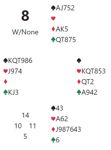 På hjerter 8 må spillefører kaste en kløver fra vest. Men nord som er alene om kløverholdet pga. lengden i fargen må enten gå ned på to kløvere – da står østs kløver – eller gi opp sparholdet.