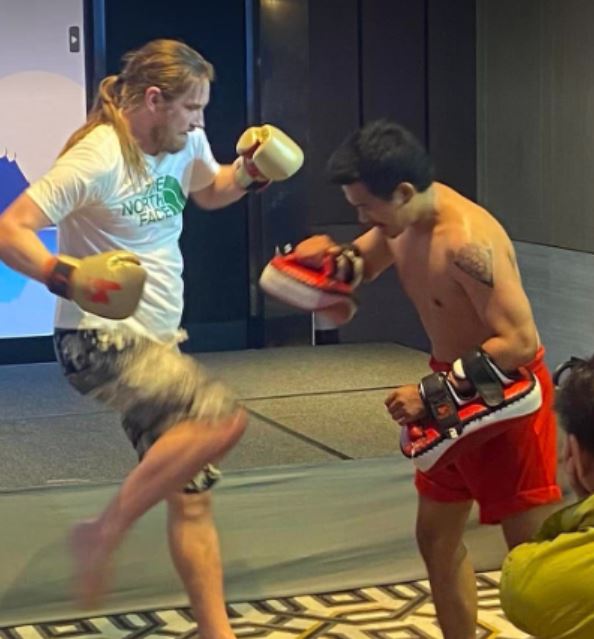 På den storslagne Victorybanketten var det først underholdning hvor de presenterte Thai boxing. Etter presentasjonen inviterte de oss tilskuere til å komme opp å prøve oss litt mot en av bokserne. Det var på ingen måte på min radar, men jaggu spratt lagkamerat Nick Jacob opp og løp opp på scenen. For den iherdige innsatsen fikk han fortjent premie.