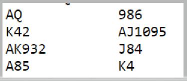 Slemmen er hardmeldt, men ikke så dårlig spesielt siden vest ble spillefører etter en overføringsmelding fra øst. Dermed er sparen beskytte mot spar gjennom i utspillet. Det er greit å se sjansene som er der. Hjerterfargen kan løse seg uten taper, da er man nesten i mål. Om det blir feilvalg i hjerter minker sjansen kraftig, men da kan jo ruter dame sitte dobbel så det blir tolv stikk med en hjertertaper da to spar i så fall kan kastes på ruteren.