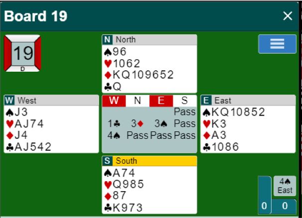 Norges lag i U-26W sin kamp mot England overføres akkurat nå på BBO. Her er et spill fra denne runden. I BBO-kampen ble det ikke svingspill, men vårt U-16 lag fikk et gladspill. Ta først meldeprøven som vest fikk ved flere bord: