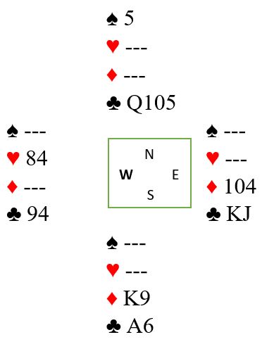 Jeg har ikke fått fatt noen norske her på morgenen så det blir spekulering hvordan Geir tenkte her. Men nord har fem spar og hjerter ess (altså minst to hjertere) og har i utspillet invitert i ruter. Dermed blir det kortfarge i kløver på han, trolig singel- eller dobbelton. Om det ikke er akkurat Q-8 blir det antagelig temmelig vanskelig uansett?