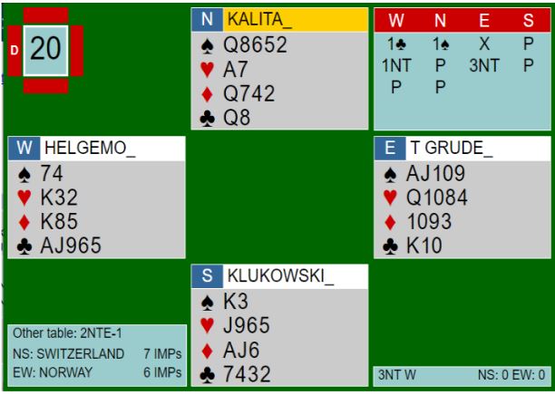 Øst visste ikke riktig hva han skulle tro, men han endte opp med å melde pass. Syd fikk for ♦K, men motparten tok resten. Faktisk har ikke Ø/V noen problemer med å vinne slem i hjerter, men Livgård - Aa nøyde seg med utgang ved det andre bordet, i likhet med de fleste andre. 7 IMP til Norge, men det var bare et plaster på såret siden Irland vant kampen 27-19 og sendte Norge ned på en foreløpig 9.plass.