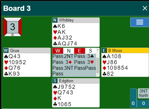 Whibley (nord) hadde vist 22-24NT, og etter syd hadde undersøkt om majortilpasning ble nord spillende 3NT. Øst spilte ut ruter 9 (lover tieren, kan ha høyere honnør, men ikke knekten) til syds konge.