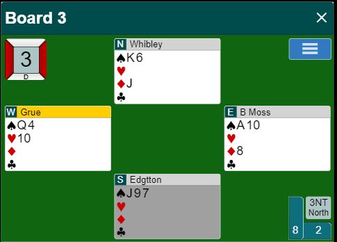 Whibley spilte kløver til damen som vant stikket. Så tok han for hjerter ess-konge før kløver ess ble spilt. Kongen falt ikke, og vest fikk for den i neste stikk. Derfra kom en lumsk liten ruter. Igjen, så såre enkelt for oss som ser hvordan det sitter, men å legge knekten nå blir fælt om øst har damen. Så esset tok det stikket. Spillefører hadde nå 0+2+2+4 = 8 stikk, og flere muligheter for det niende.