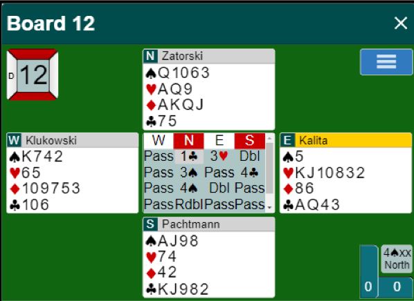 Jeg kjenner ikke Zatorski-Patchmann sitt system, men det må vel være sterk, kunstig 1 kløver siden han sa kun 3 spar over makkerens dobling (viste spar) over 3 hjerter innpå fra øst. Hvordan Kalita etterpå kunne finne på å doble 4 spar har jeg ingen formening om. Og han ble brutalt straffet for det da Zatorski redoblet.