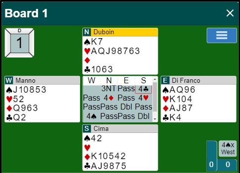 Her var Duboin og Cima (N/S) brutale. Mot vests 4 spar doblet spilte nord ut hjerter ess fulgt av hjerter dame til kongen, og syd stjal. Fra syd kom ruter til stjeling hos nord, så kløver til syds ess og nok en ruter til stjeling. Det var allerede to doblede, og slik det så ut måtte fortsatt syd få for ruter konge, den tredje beten, N/S +500.