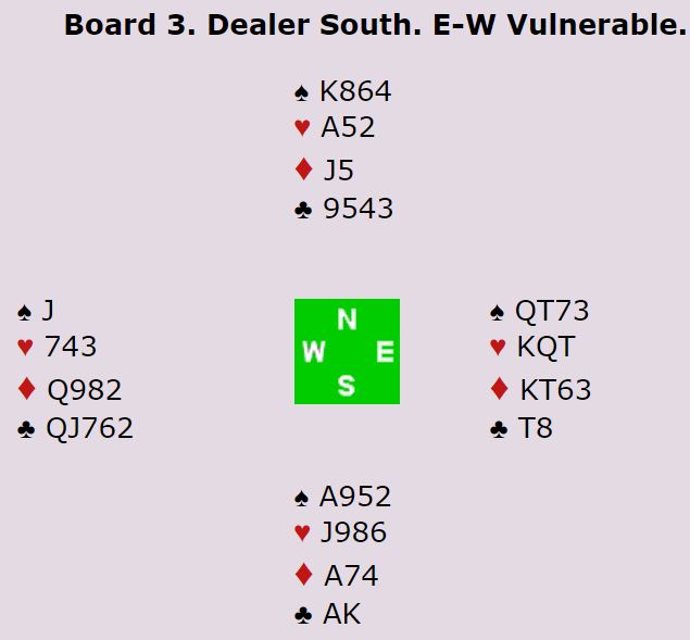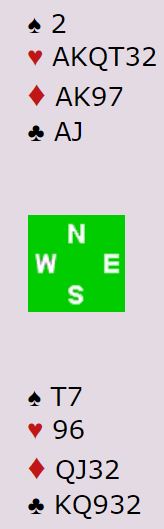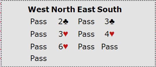 Ganske uvanlig, N/S har slem i begge rødfargene, men de lar Ø/V få spille doblet delkontrakt med en trumffarge hvor de har ti kort til sammen!