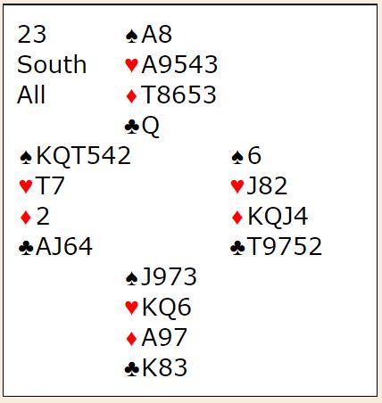 Syd hadde egentlig to ruterstoppere, men med ruter 7 i utspill til 10, knekt og ess etterfulgt av ruter konge som felte damen satt Robson og så ned på ruter 9-3, og spillefører hadde plutselig potte tett farge (!) med 8-6-5-4 som kunne godspilles ved å presse ut nieren. Det var trist å ikke sitte igjen med den fete saksekombinasjon 9-7 på det tidspunktet. Spillefører hadde ti sikre og endte opp med elleve stikk, Italia +460.