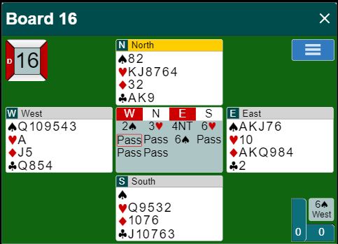Dette er fra bordet Helgemo satt vest og Grude øst. Vests pass på syds 6 hjerter viser interesse. Jeg har fått høre at de bruker DOPI når det meldes inn etter 4NT Key Card, så passen viste ett ess. Det er viktig å ha avtaler når en skal svare på Key Card Blackwood og får en melding på sekstrinnet foran seg. Om en ikke har det bør det i alle fall dobles med essløs hånd som en advarsel.