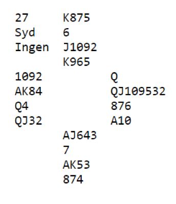Det ble imidlertid ganske greit for Ovesen da han ventet med kløvervalget så lenge som mulig, og da var det plutselig ikke noe valg lenger! Syd hadde jo åpnet med 1 hjerter, og utover i spillet fant spillefører ut at syd også hadde tre spar, og fire ruter. Sammen med femkorts hjerter er det tolv kort, og da blir det kun igjen en kløver på han. Så esset fulgt av liten til finesse ble til en markert finesse, elleve stikk og +650. Spillet ga dem 12 IMP, og deres siste kamp som altså ga dem 3.plassen totalt ble vunnet med 8 IMP.
