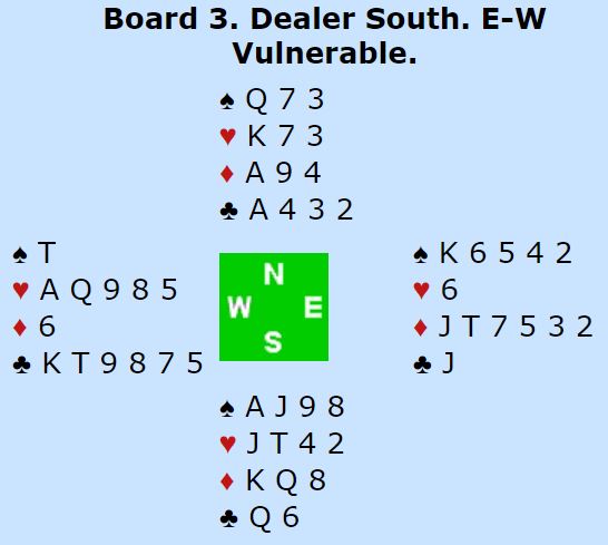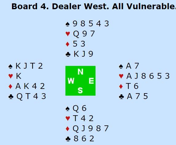Stein åpnet med 1 kløver, og vest meldte inn 1 hjerter. Jon-Egil sa 1 spar som for dem betyr maks trekorts spar. Stein kom tilbake med 1NT, og vest hoppet til 3 kløver. Jon-Egil foreslo 3NT, og det lå et lite øyeblikk an til uavgjort spill. Men så sannelig mente vest at han burde melde enda en gang og sa 4 kløver! Da mente Jon-Egil at det fikk være nok og doblet.