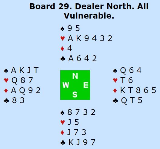 4NT var RKCB og 5♣ viste ett Ess. 6♥ bekreftet at hjerterdamen var på plass, og benektet Konger. +480 og 10 IMP inn. Den slemmen var det ingen andre som fant i noen av klassene!