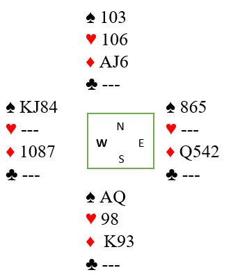 Nå spilles altså spar ess og spar dame, og som allerede sagt er det ingen problemer om øst vinner med spar konge. Men som du ser vinner vest det stikket, og han må spille ruter. Med liten ruter fra vest får du med denne kombinasjonen hos N/S to sjanser ved å legge liten fra nord. På ruter fra vest og sekseren fra nord må øst på med damen slik det her sitter, og da står jo A-J. Det er ruter 9 som er så viktig. Men kanskje produserer øst ruter 10 i det stikket. Da stikkes med kongen, og da må ruterfinessen prøves. Det hjelper selvsagt ikke om vest spiller ruter 10 idet han er inne på spar konge, for da dekkes simpelthen med knekten, og nieren blir god.