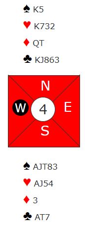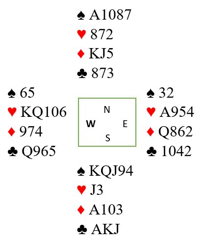 Som du ser vil en eventuell kløverfinesse mislykkes, og etter det vil det bli tipping i ruter, med ti stikk eller en bet som resultat.