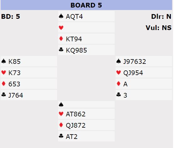 Mot oss spilte øst 4 spar doblet og gikk fire, N/S +800 som for oss ville bli tapt spill hvis de fant frem til 6 ruter ved andre bordet, vunnet spillet mot utgang. Men ved det andre bordet fikk vår lagkamerat på østs plass spille 3 spar doblet! Hvis han hadde klart maks med stikk (7) ville det blitt -300 og 11 IMP inn. Om han hadde fått samme antall stikk som spillefører fikk mot oss, altså tre bet i 3 spar doblet ville -500 gitt en hyggelig 7’imper inn. Men spillefører "kollapset" helt og gikk ikke to eller tre bet bet i 3 spar doblet, noe som virker normalt, og heller ikke mer usannynlige fire doblede! Det ble dessverre fem doblede bet i 3 spar doblet, 4 stikk! Hvordan det gikk til spurte jeg ikke om, det var ikke fristende å få vite det... Så med -1100 i 3 spar ble spillet tapt med 7 IMP i stedet for 7 eller 11 IMP inn.