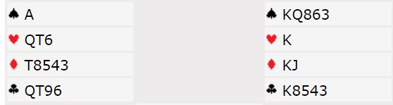 Med hjerter eller spar ut må det bli det samme spillet om det er vest eller øst som er spillefører. Hvordan vinnes da 6NT?