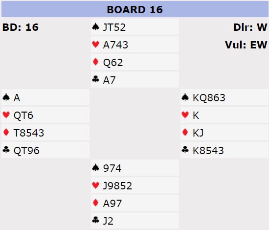 I diagramsituasjonen spilles simpelthen ruter ess og en ruter til syds konge, og vests tar de to siste stikkene, 12 stikk.