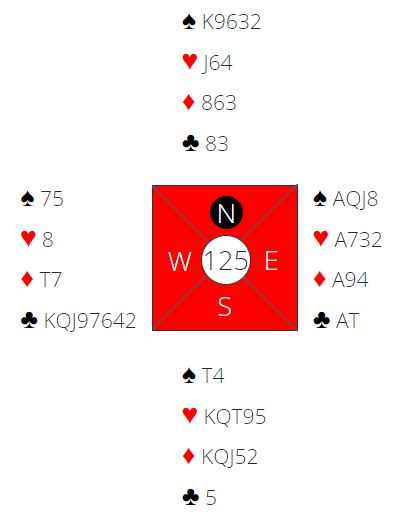 Det er en bedre kontrakt siden det er ett ekstra stikk ved hjelp av en hjerterstjeling hos øst (ekstra trumfstikk). 6 spar kan vinnes for egen maskin uansett utspill, syd kan skvises om det spilles godt. Men hele elleve par vant 6 spar enkelt etter ruter dame i utspill fra syd. Så å stoppe i utgang ga under middels. Kun fire par gikk bet i 6 spar, alle etter at syd unngikk å spille ut ruter dame.