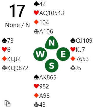 De som stoppet i 5 kløver fikk litt under middels da det var noen som spilte 3NT, og de fikk litt over middels. Noen få par var i 7NT og gikk bet.