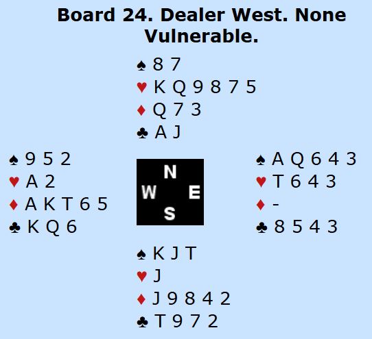 Nettopp det skjedde, Ø/V meldte 4 spar og gikk to bet ved det andre bordet. Det ga 6 IMP inn som var akkurat nok til å gå forbi.