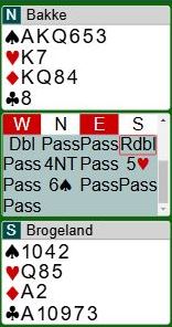 Brogeland-Bakke meldte 6 spar, en god slem. Øst spilte ut kløver 6. Da stikkes, så spilles trumf. Hvis trumfen sitter 2-2 blir det raskt "claim". En ruter kan jo trumfes hos syd og det blir kun en hjertertaper. På ess-konge i trumf fulgte vest farge, men øst viste seg å ha singelton trumf. Merk at om spar knekt hadde vært singel ville det vært nesten "claim" også med 3-1 i trumf siden en ruter kan stjeles før den siste trumfen tas ut. Det eneste som må til er i så fall at ikke ruter sitter 6-1 så den med singelton ruter kan trumfe i andre runde ruter. Og selv om ikke trumfen satt 3-1 er det en bra sjanse ved å ta A-K i ruter og spille en liten ruter til stjeling. Men slik det satt i Las Vegas ble det en sur bet:
