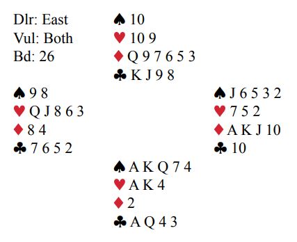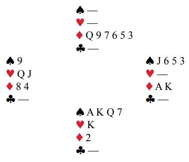 Sparhonnør tar med seg nieren fra vest fulgt av nok en stor spar som bekreftet sparsitsen. Syd har da igjen en saks over øst med Q-7 bak J-6. Så den siste hjerteren, og øst er ferdig mann. Berkowitz leste sitsen som en åpen bok. Det er slik at om øst kaster en spar står spilleførers spar, så en ruterhonnør må kastes. Men da, med tre kort igjen fridde Berkowitz seg med sin single ruter til østs gjenværende single ess før øst i to-kortsposisjonen måtte spille unna spar J-6 til syds saks, dame-7. Tolv stikk i 3NT ga omtrent alle poengene.