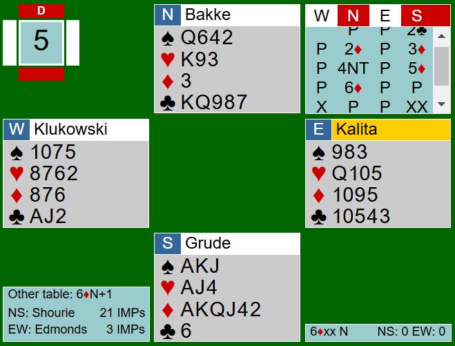 Det startet med to ganger pass før Grude åpnet med 2 kløver, sterk og kunstig melding. Bakke svarte 2 ruter, og syd meldte 3 ruter som viser en skikkelig god og lang farge. Da var ikke nord i tvil, her bør det meldes slem. Bakke gikk nord rett i 4NT – spørsmål om nøkkelkort (essene og trumf konge). Syd viste ett eller fire nøkkelkort, sett fra nords side åpenbart fire i denne settingen. Så Bakke meldte 6 ruter, og da det gikk pass og pass fra øst og syd kom Klukowski med en melding som er vanskelig å forstå: dobler! Dobling på mistanke? Hvorfor det? Utspillet ba kanskje om kløver ut - syds første melding - selv om det ikke viste kløverfarge?