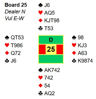 Ved å tippe feil i stikk en og få hjerter over seg var altså alle hjerterne tatt bort og nords hånd nokså ubrukelig. Det bør etter den starten bli kun ett ruterstikk, men det behøves fire for å vinne 3NT! Øst må feile og ta for ruter ess idet det spilles ruter til knekten. For å kanskje kunne friste øst litt ble kløver spilt til damen sånn at kun kløver ess singel lå igjen på bordet, så ruter til knekten. Og så sannelig, en bra spiller på østs plass stakk med esset - en grusom feil og en enorm gavepakke. Øst fortsatte (ivrig) med kløver til esset. En ruterfinesse til gikk fint og damen falt under kongen, 2+1+4+1= 9 stikk.