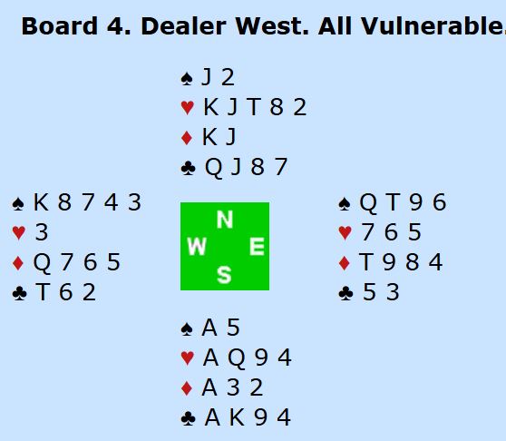 4NT var Key Card Blackwood med hjerter som trumf. Syds 6 spar var "Velg storeslem makker". Slik så hele spillet ut:
