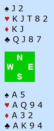 Der er det ikke noe avkast på sidefargen kløver. Ruter knekt gir imidlertid en sjanse for det trettende stikket, men da må vest ha ruter dame. Så i dette tilfellet vil 7 hjerter vinnes, dog heldig for det skjer etter å ha truffet på en 50% sjanse.