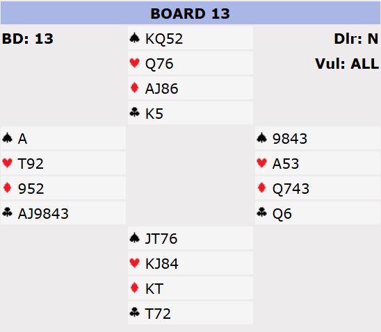 Ved ni bord var N/S i 4 spar. Syv av dem gikk bet. Å vinne +620 ga 96% score!