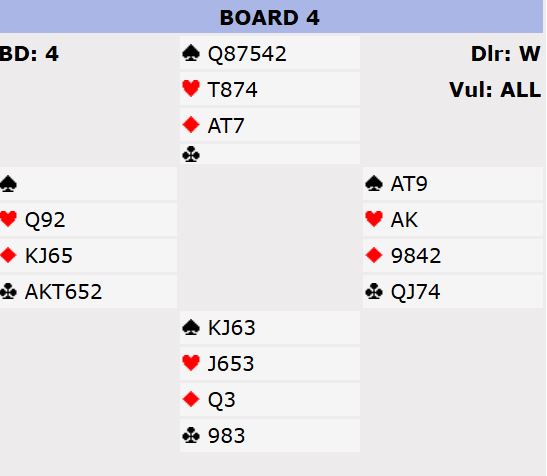 Syd passet og vest hoppet til 4 hjerter. Nå meldte øst 6 hjerter så det ble samme kontrakt bed begge bord i den kampen.