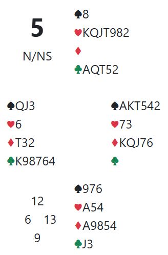 Selv fikk jeg spille 5 hjerter med tolv stikk etter spar ess i utspill. Ved det andre bordet var imidlertid ikke lagkameratene heldige da de lot N/S spille 6 hjerter og bommet motspillet, -1430 og 13 IMP ut for vårt lag.