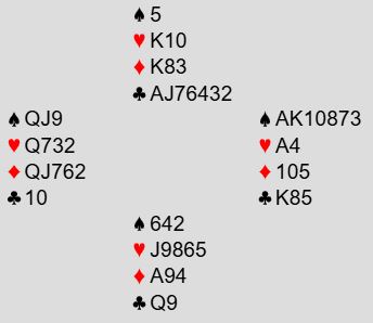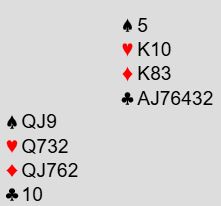Og det ble det selv om Heimdal med Kristoffersen - Molberg - Vist - Larsson til slutt vant med 31 IMP. De vant imidlertid kampen etter å ha innkassert 29-0 på de fire siste spillene. Tidligere i kampen ble det en tosifret gevinst i favør Heimdal i det spillet vi ser på her, en motspillsprøve. (Giver nord/alle i sonen)