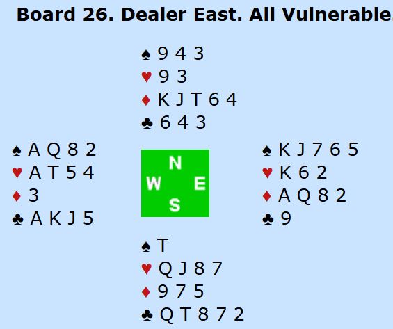 Ps. Hvis syd åpner med 1 ruter, eller meldingene starter som ved det bordet Polen satt N/S, bør det antagelig gå an å finne frem til trumfkontrakt. Mest naturlig er det vel å komme i 5 ruter, fargen de har 10 trumf til sammen. Men 5 ruter går bet om syd er spillefører og spar dame kommer i utspill. Ø/V må få tatt de tre stikkene med det samme, hvis ikke fyker 5 ruter hjem. Så hvis nord på en eller annen måte blir spillefører i 5 ruter er det veldig vanskelig å bete kontrakten. For da må øst underspille kløver ess mot en kontrakt på fem-trinnet til makkerens konge, så spar dame i skift (åpne kort motspill...) Det skjer normalt ikke, så nords 5 ruter ville føket hjem. Men så skjer det vel heller ikke at den kontrakten havner på nords hånd.
