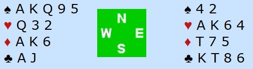 Både Bogø og Brekka satt øst og hørte 2NT fra makkerne sine, henholdsvis Sivertsvik og Lindstrøm. Etter å ha overført (Bogø med 4 kløver, Brekka med 3 ruter) meldte øst 4NT – Key Card Blackwood. Vest viste fire nøkkelkort. På 5NT fra øst – storeslemsinvitt og spørsmål etter spesfikk konge – sa vest 6 ruter, ruter konge! Da kunne øst faktisk ta en ganske kalkulert gambling på storeslem. Ruter dame var et gullkort. Mot vests AK gjør det kortet at øst "ser" tretten stikk om hjerteren går (1+7+3+2=13) og om 7 hjerter står vil det stå i 7NT også i dette tifellet. Det er et bitte lite faremoment her, at vest har A-K dobbelton i ruter, men det er veldig usannsynlig. Og det er dessuten bitte litt gambling å si 7NT med hensyn til de syv hjerterstikkene også, for i verste fall har vest kongen dobbel i hjerter. I så fall må hjerteren sitte 2-2. Om vest har trekorts hjerter (eller damen) er storeslem helt perfekt, og her som vest faktisk hadde bare dobbelton hjerter hadde hun knekten i tillegg som økte sjansen for at hjerteren går.