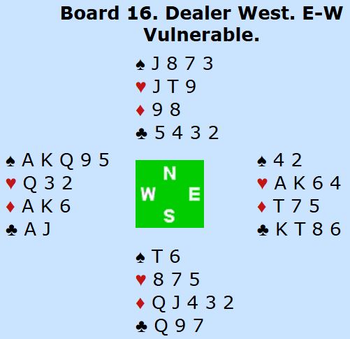Det var altså tretten bord i finalen, og på tre av dem ble det spilt utgang (!) på dette spillet. Seks Ø/V-par spilte 6 hjerter, ett par var i 7 hjerter. Kun tre par tok sjansen på 7NT, og to av dem var altså norske par, og for +1520 fikk de 92%.
