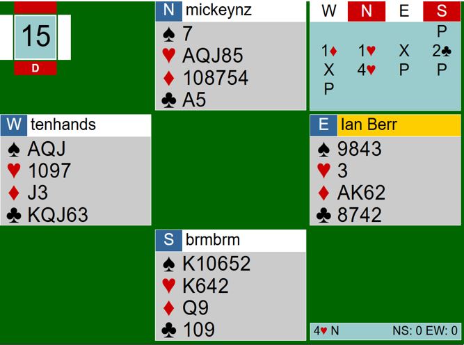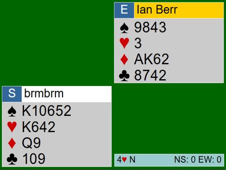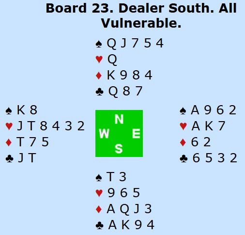Ved det andre bordet var N/S med til 3 hjerter, men lot så Ø/V spille 3 spar som gikk to bet, N/S +100. N/S gjorde altså det teoretisk riktige, de unngitt 4 hjerter som bør gå bet, men de tapte likevel 11 IMP på spillet.