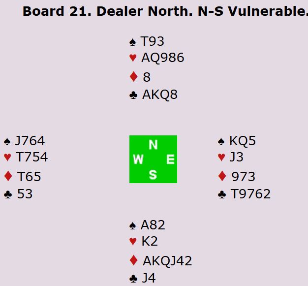 Et enkelt spill beviser ikke mye om hva som er best, men i dette tilfellet kom godt over en tredel av N/S-parene i 3NT som gikk helt galt, og de fleste av dem gjorde det etter åpning 1 kløver. Av dem som åpnet med 1 ruter klarte flere å finne den fine delkontrakten i ruter hvor det ble ni eller ti stikk, andre spilte delkontrakt i spar. Ingen fikk høyere score enn +140 på N/S.